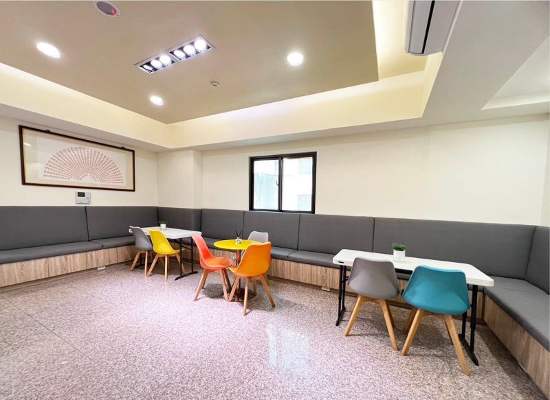 獨立團體休息空間,每日都有服務人員清潔打掃。茶水間飲水機供應熱水,也有瓶裝水可飲用。