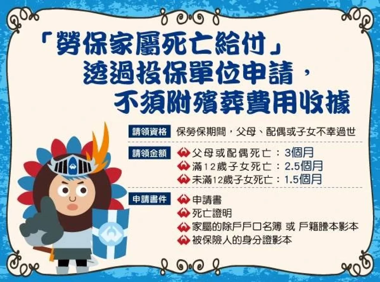 傳被保險人在保險有效期間因傷病或職業傷害/罹患職業病死亡時,由「支出殯葬費之人」提出申請...