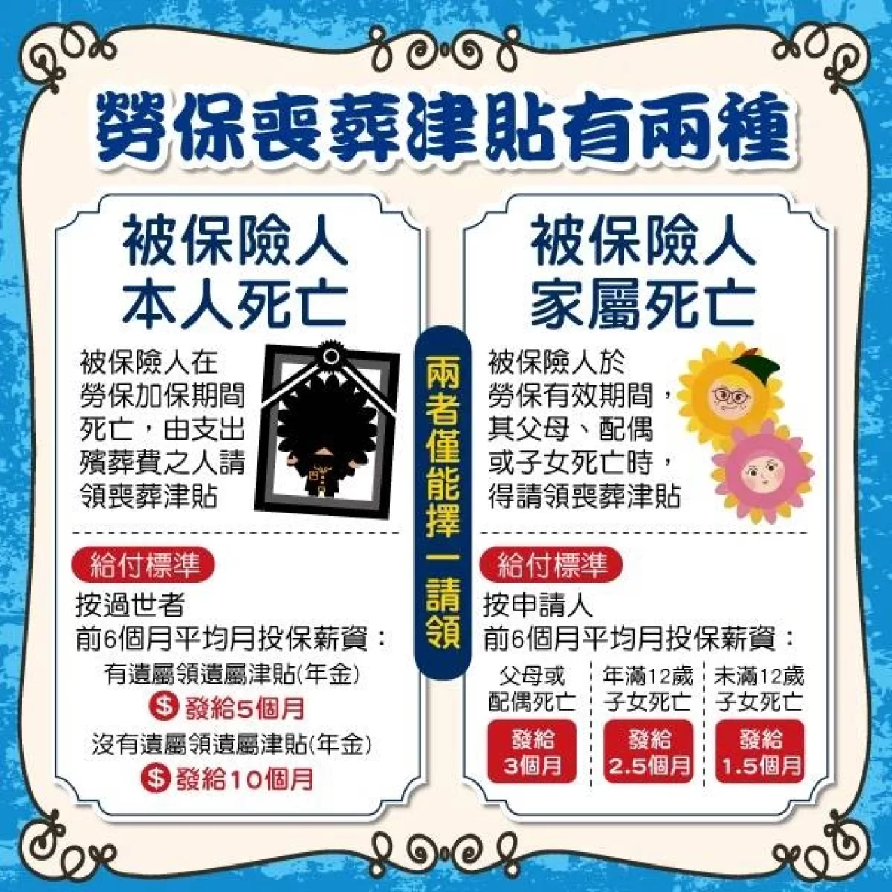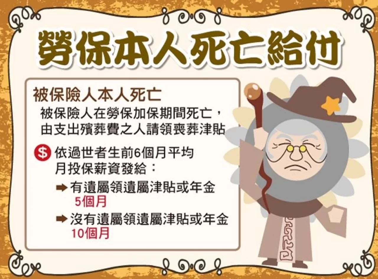 - 被保險人遺屬若不符合請領遺屬年金或遺屬津貼的條件,或無遺屬,可由「支出殯葬費之人」申請,請領喪葬津貼10個月。